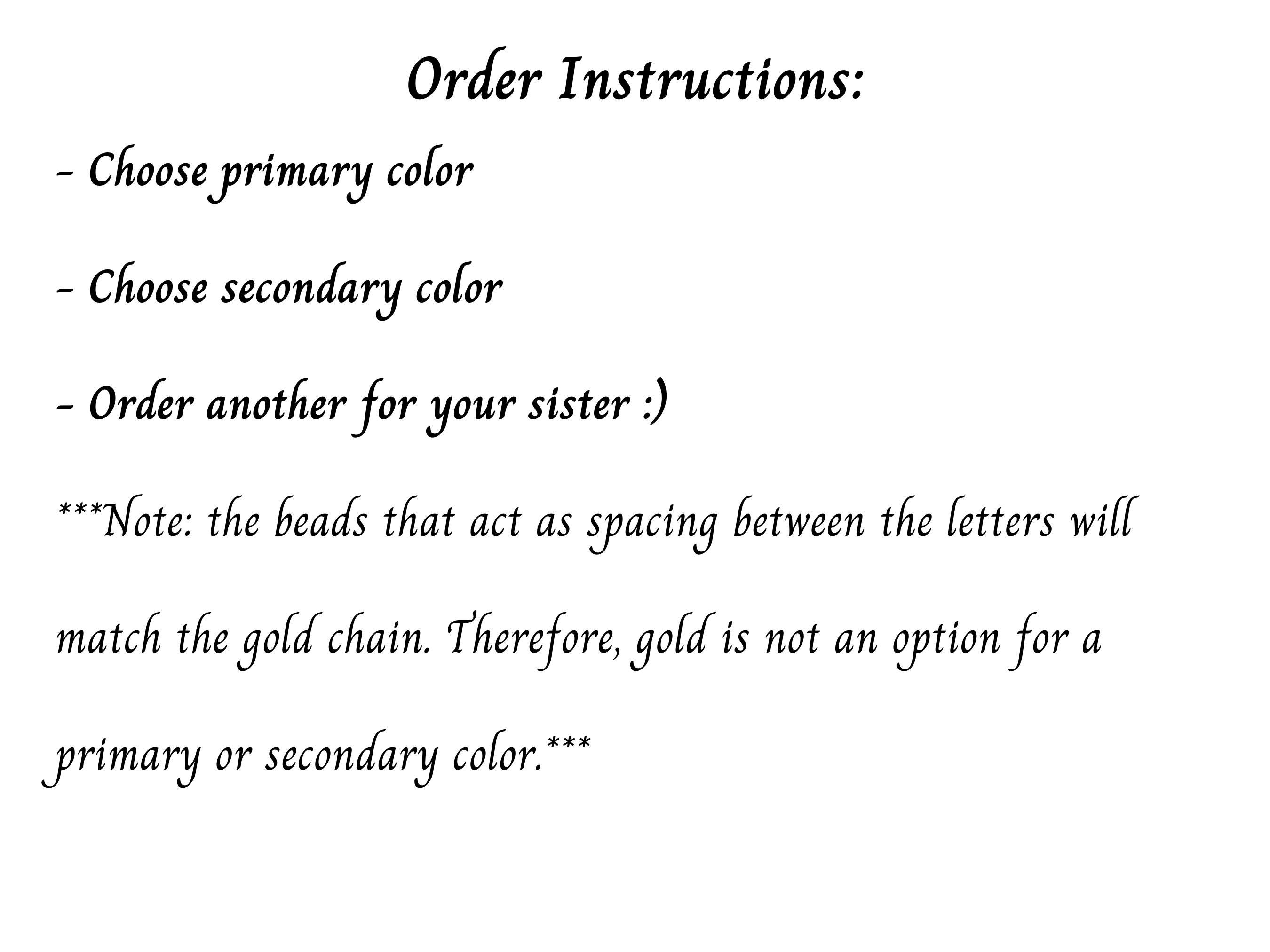 Note: the beads that act as spacing between the letters will match the gold chain. Therefore, gold is not an option for a primary or secondary color.