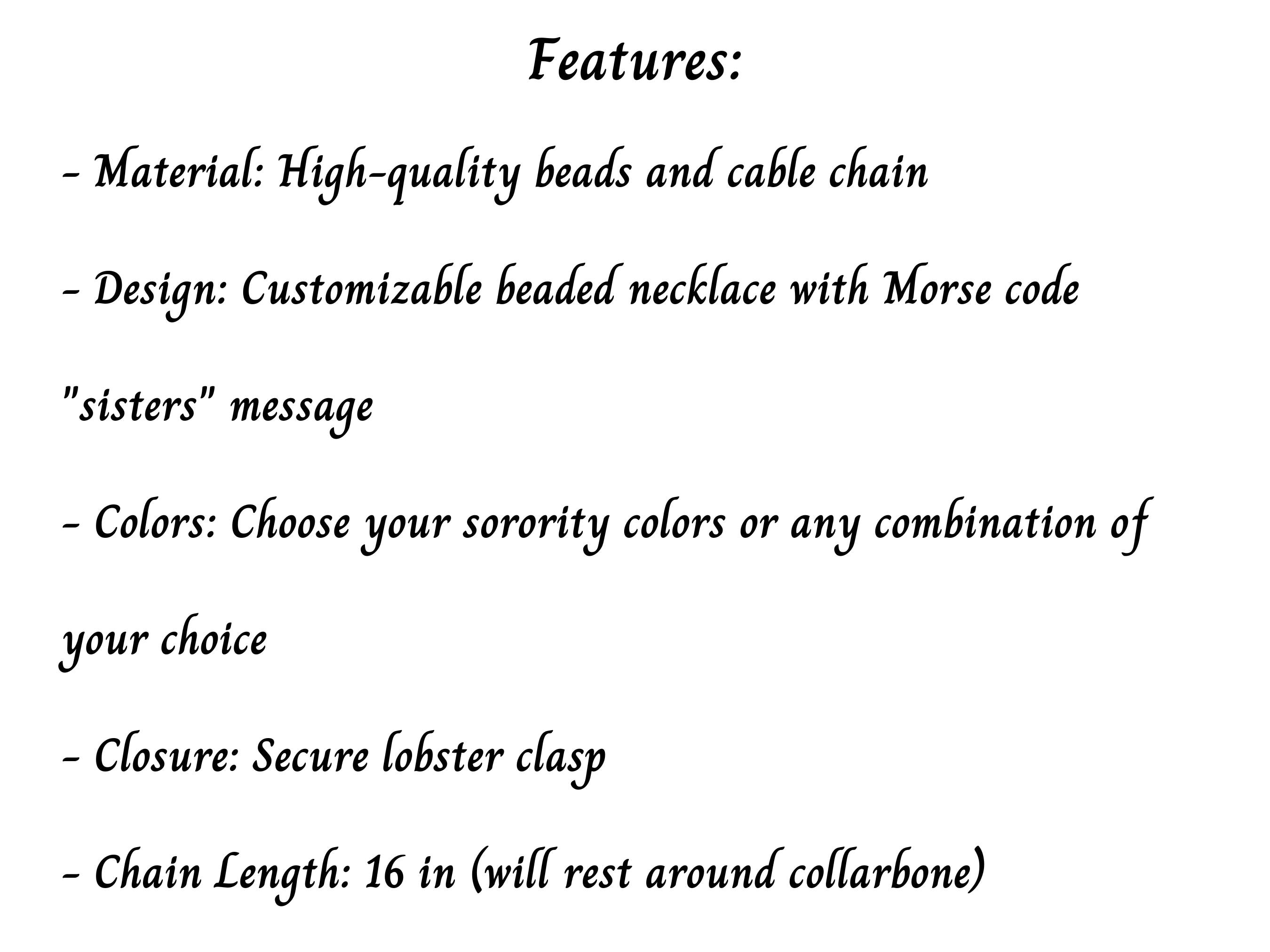 Celebrate the bond of sisterhood with this customizable handmade beaded chain necklace, designed especially for sorority sisters. The beads on this elegant necklace spell out "sisters" in Morse code, adding a meaningful and secret message that only those close to you will understand. Whether you’re gearing up for a big event or simply want to express your Greek spirit, this necklace is a stylish and thoughtful addition to your collection. Made to order, each necklace is handcrafted with care, allowing you to choose your sorority colors and create a truly personalized piece of jewelry.