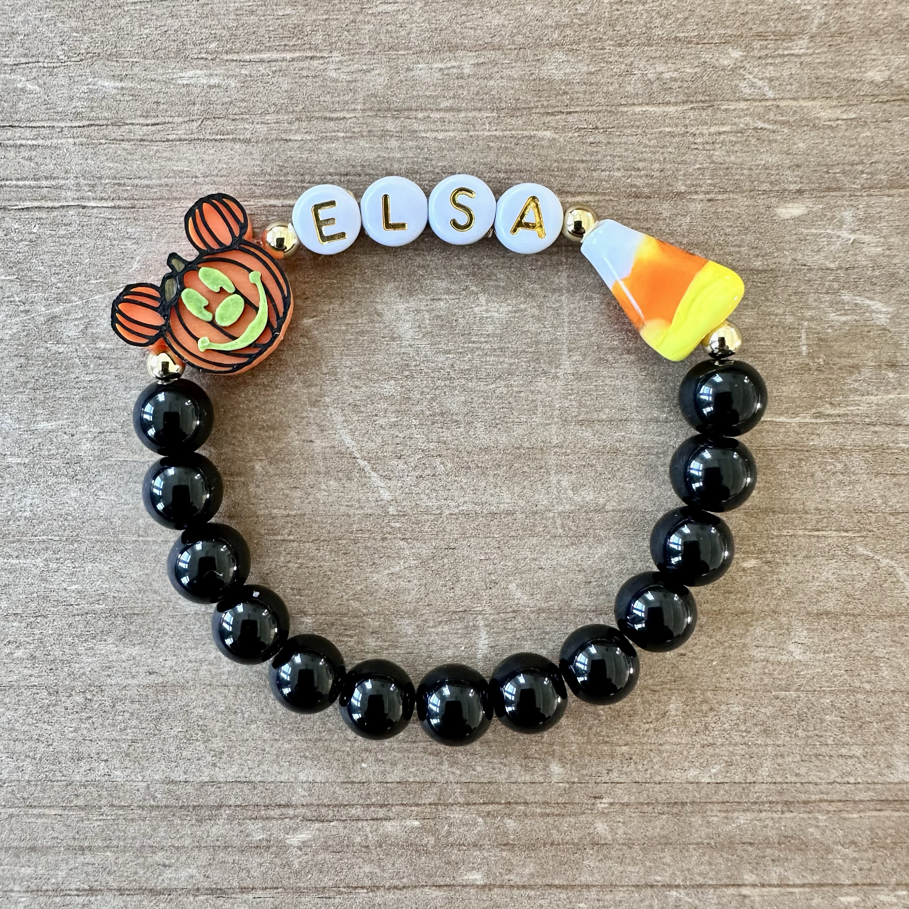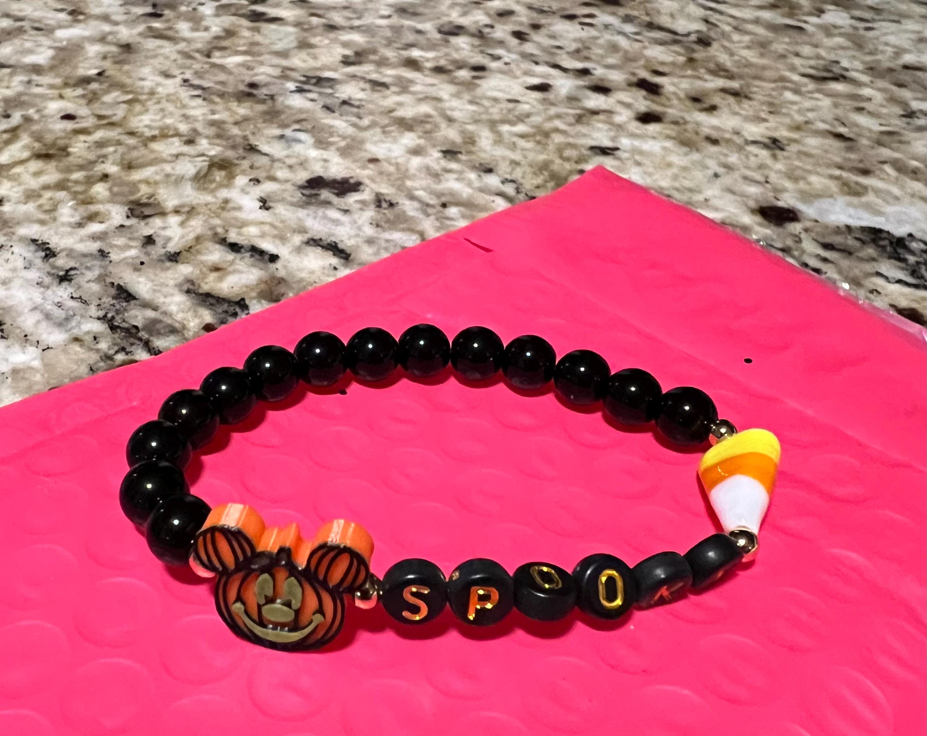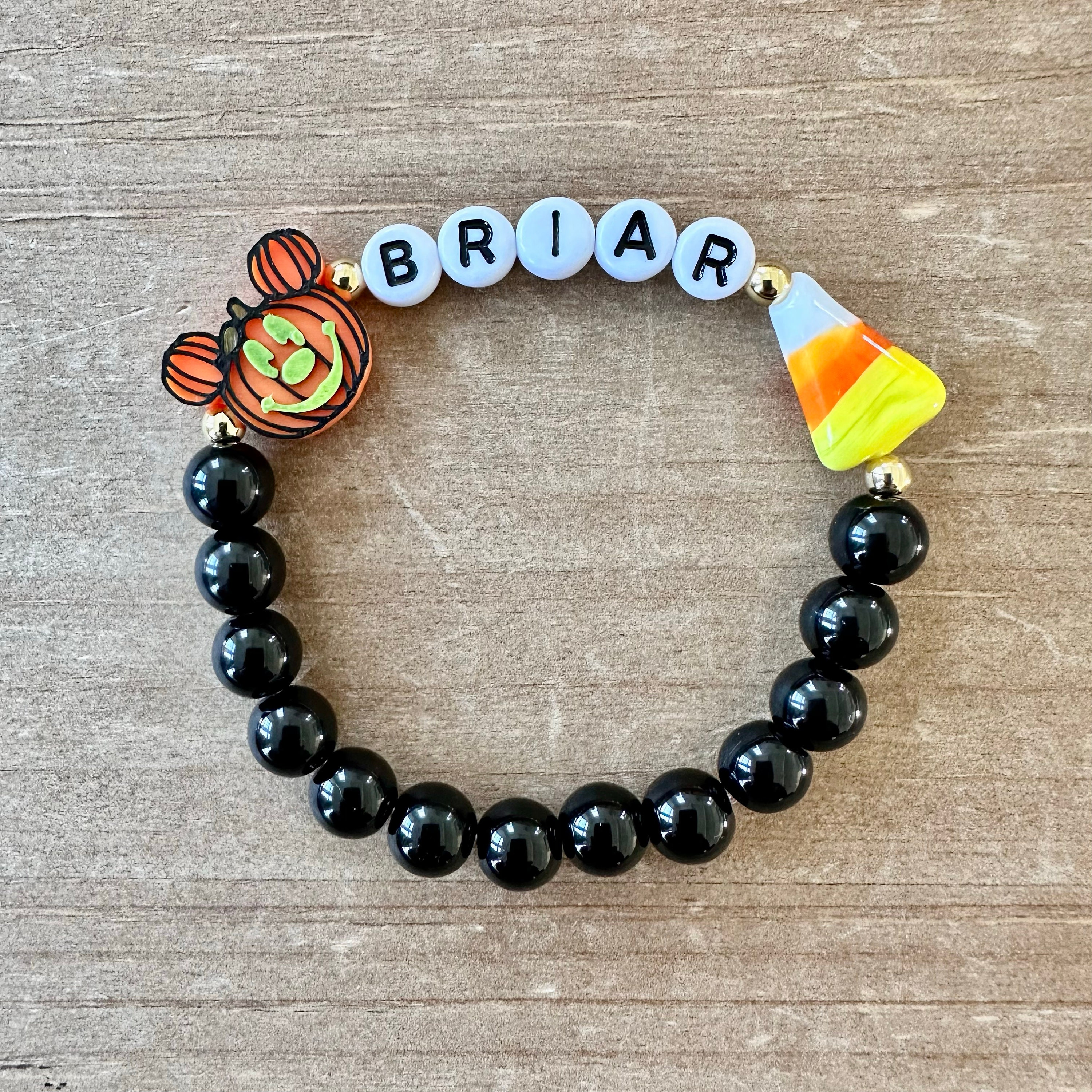 This festive bracelet is handmade using a 14.6 mm plastic Pumpkin bead, black jasper beads to white glass beads, acrylic letter beads, a darling ceramic candy corn and gold plated beads.