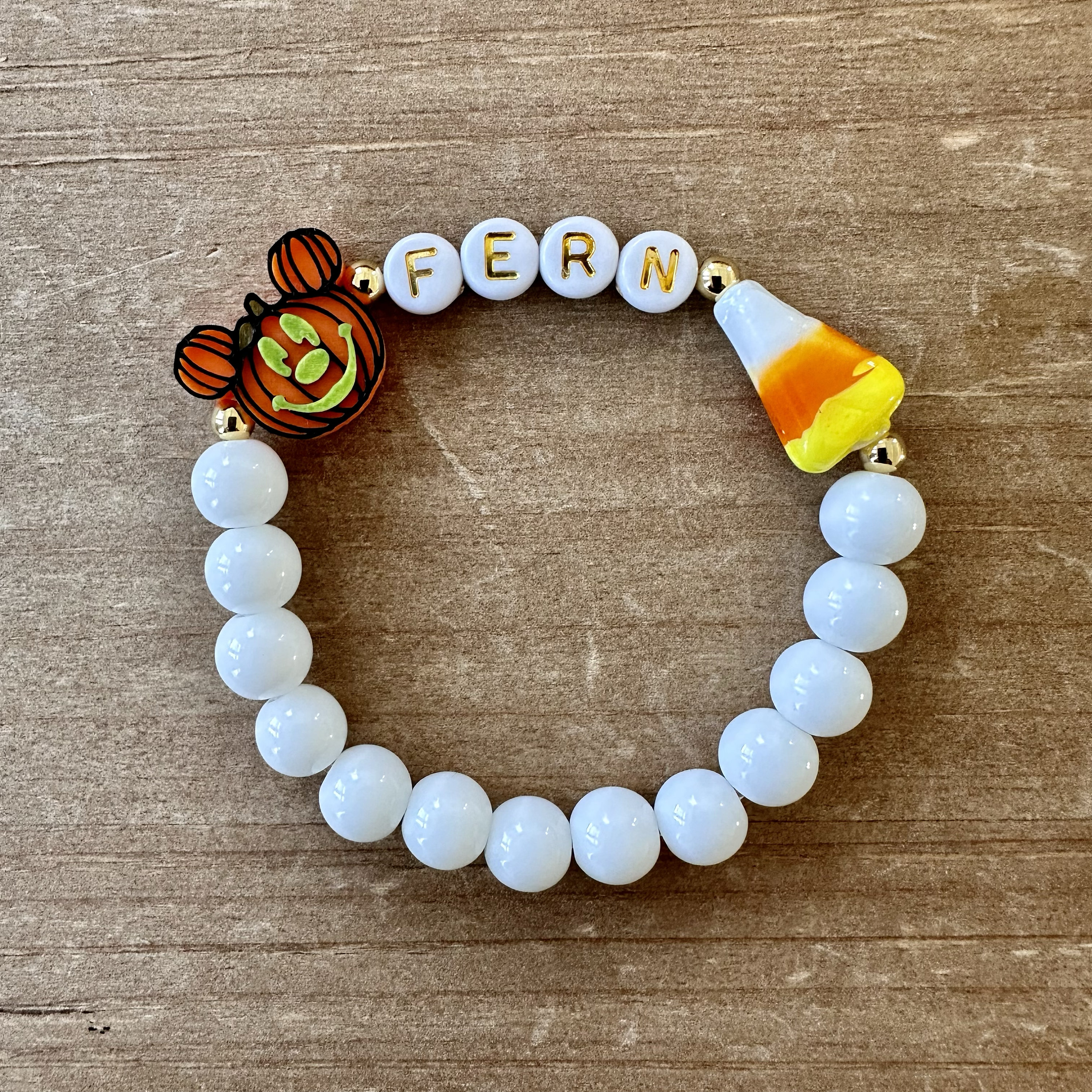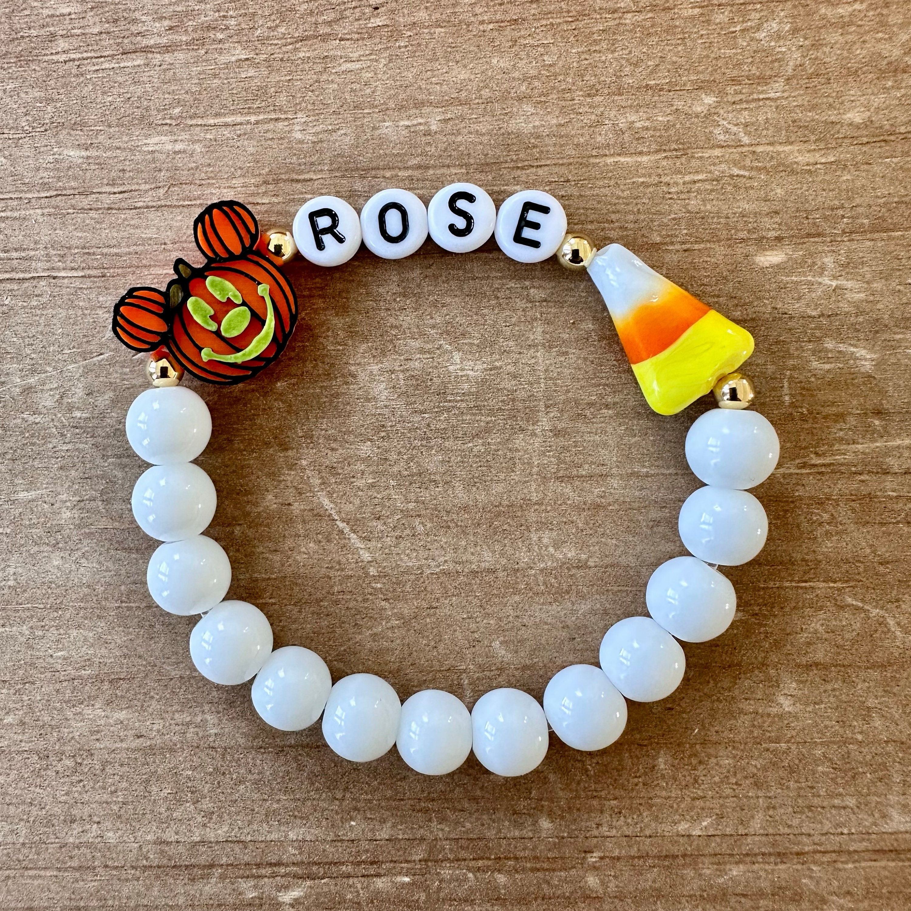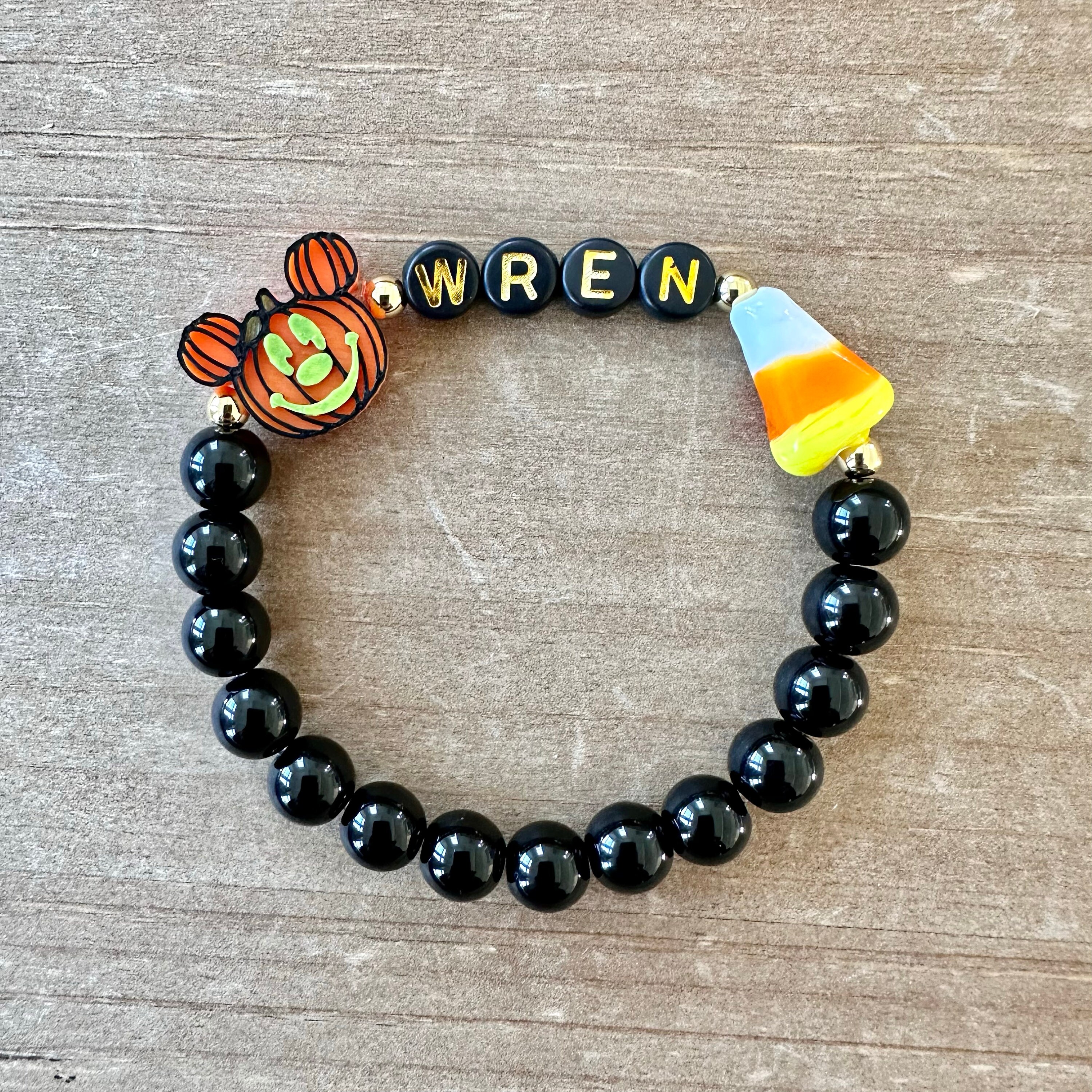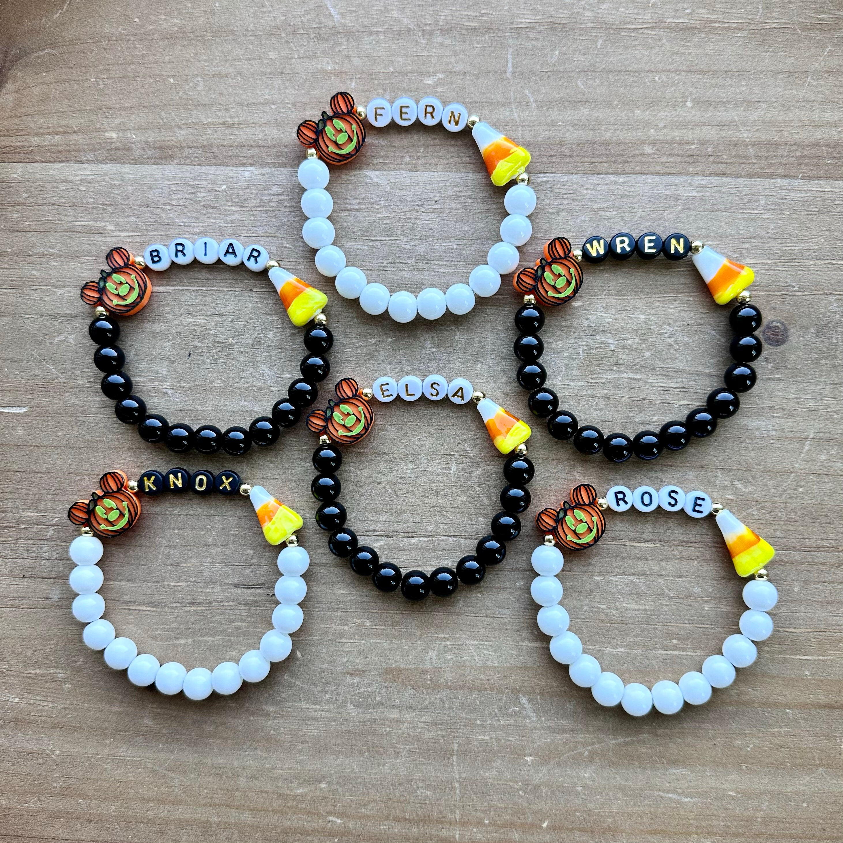 This festive bracelet is handmade using a 14.6 mm plastic Pumpkin bead, black jasper beads to white glass beads, acrylic letter beads, a darling ceramic candy corn and gold plated beads.