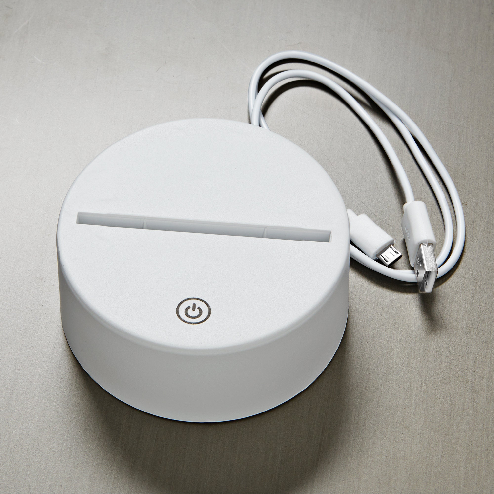 - White plastic base measures 3.75"D x 1.5"H