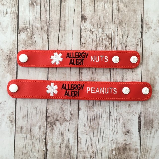 These allergy alert bracelets are bright red to catch attention with white and black lettering so they are easy to read. They are made from a durable marine vinyl, backed with felt for comfort, and secured with a plastic snap. Each bracelet has 2 snaps for adjustable sizing.