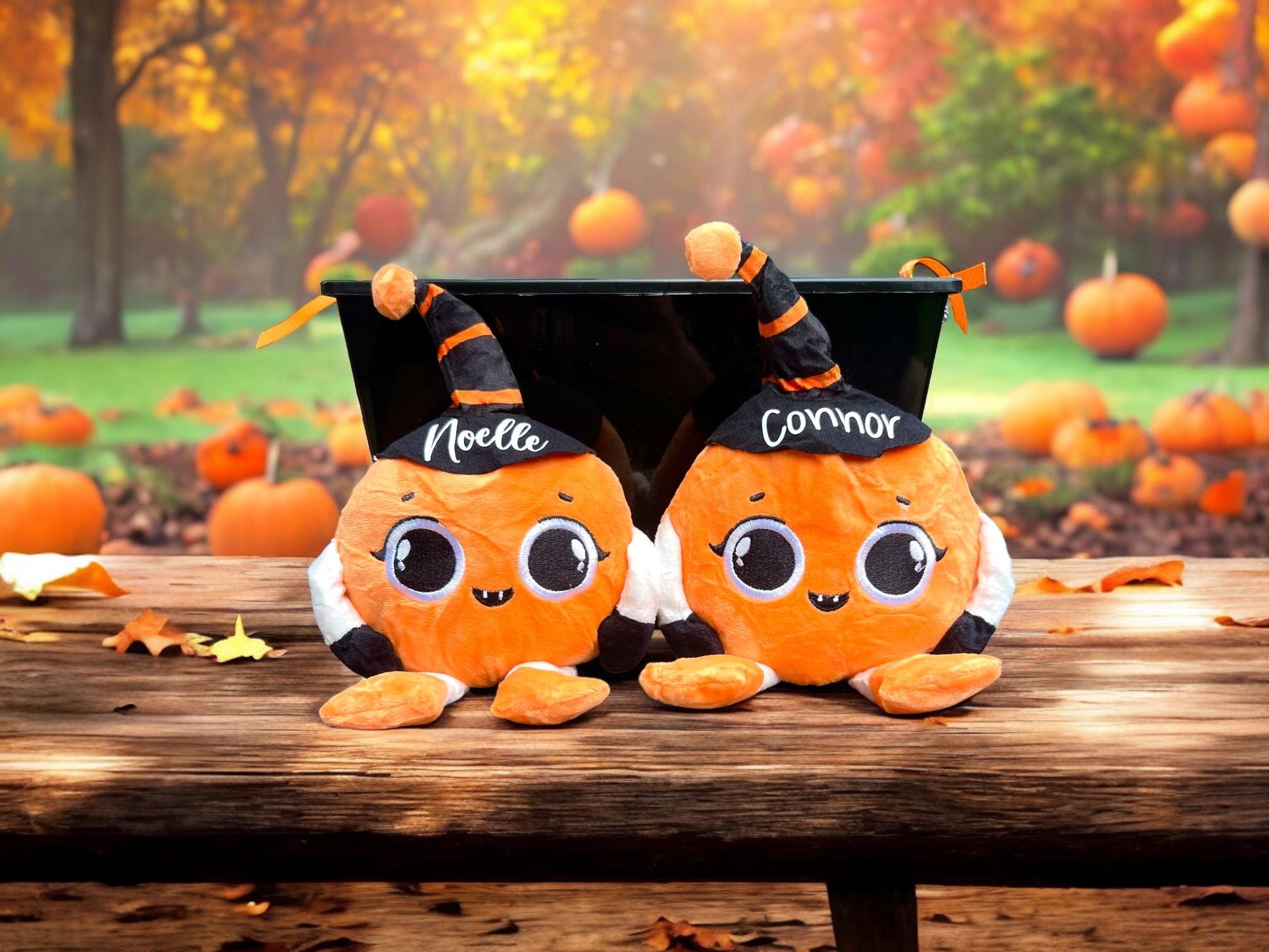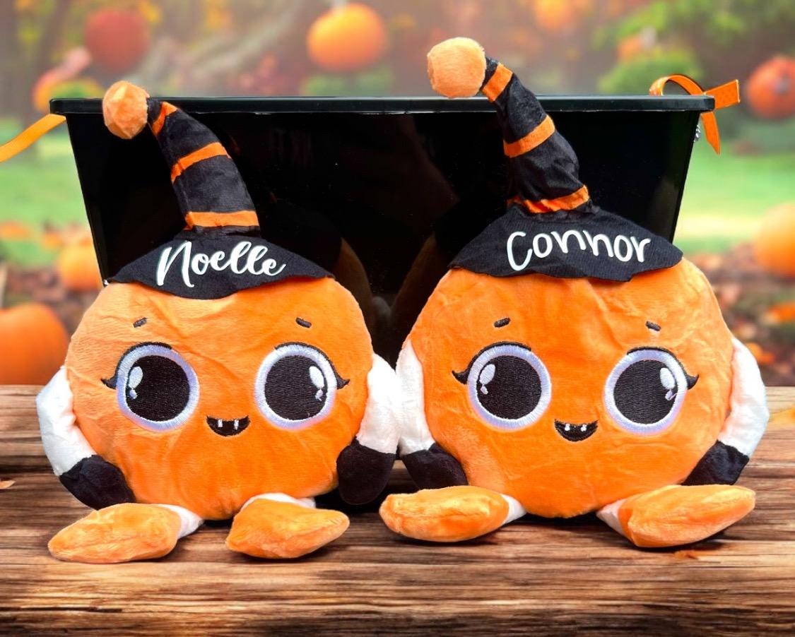 How adorable are these personalized Halloween pumpkin stuffies? We absolutely adore them! These pumpkin stuffed animals are the perfect kids Halloween gifts. They are perfect for young children and toddlers.