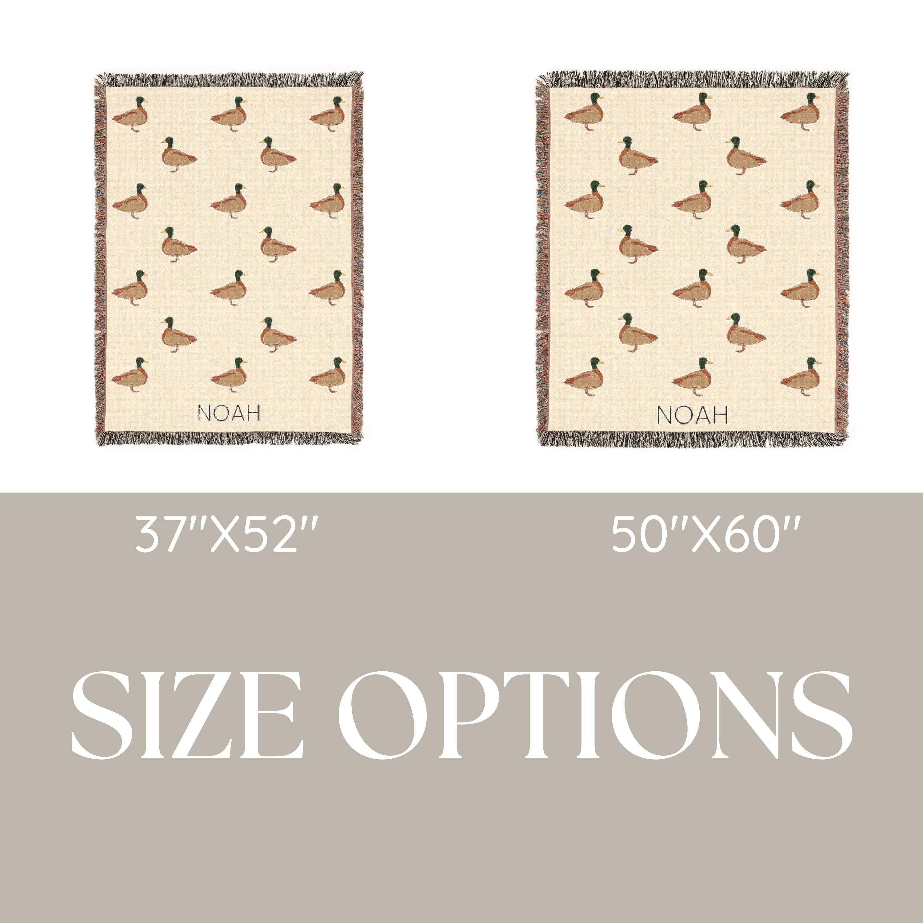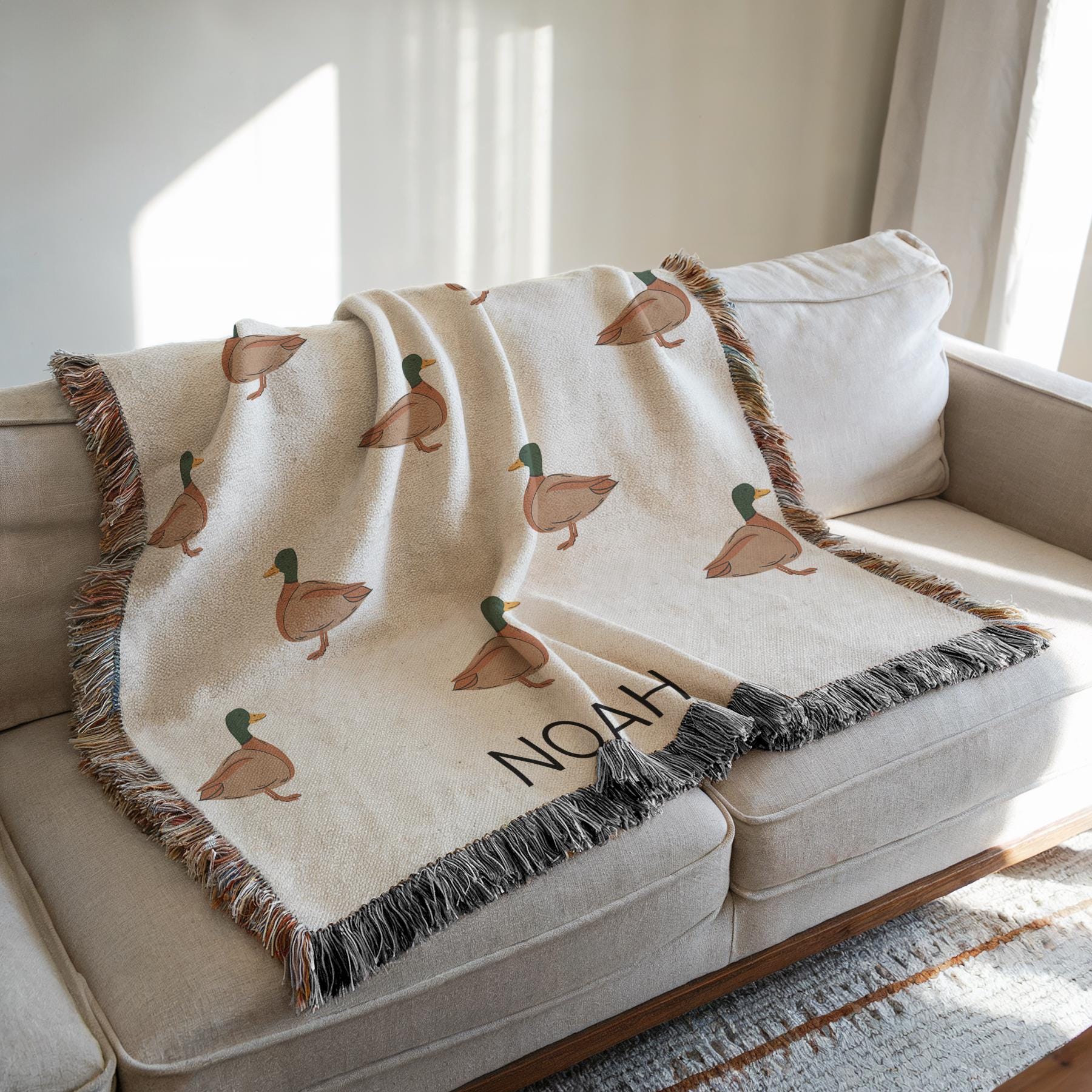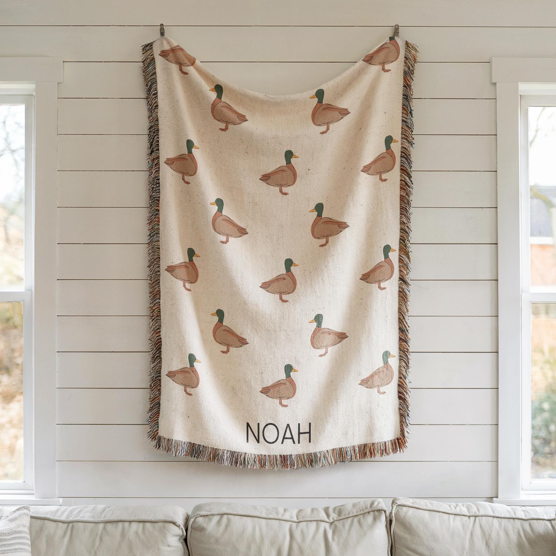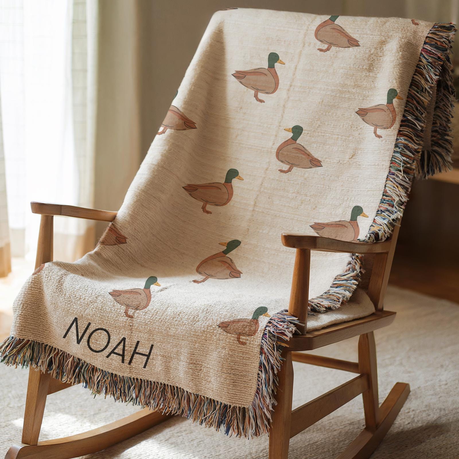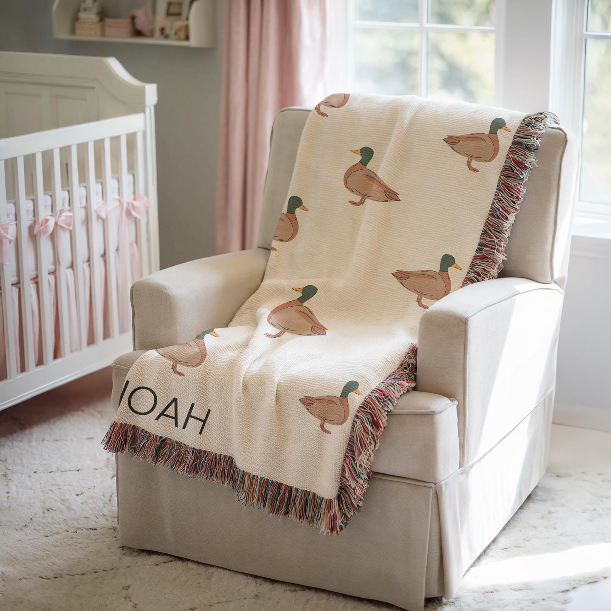 🦆Bring the charm of the great outdoors to your little one’s nursery with this personalized woven blanket featuring an all-over mallard duck pattern. Perfect for a nature-themed or duck-themed nursery, this cozy blanket comes in two sizes (37x52" and 50x60") and can be customized with your baby’s name for a heartfelt touch. Woven out of 100% cotton yarn, this durable and cozy blanket features colorful fringe on two edges and black-and-white fringe on the other two for a distinct, handcrafted look. This blanket is both stylish and durable, making it an heirloom-worthy keepsake for baby or anyone who loves wildlife. Ideal for baby showers, birthdays, or as a unique gift for nature-loving families.