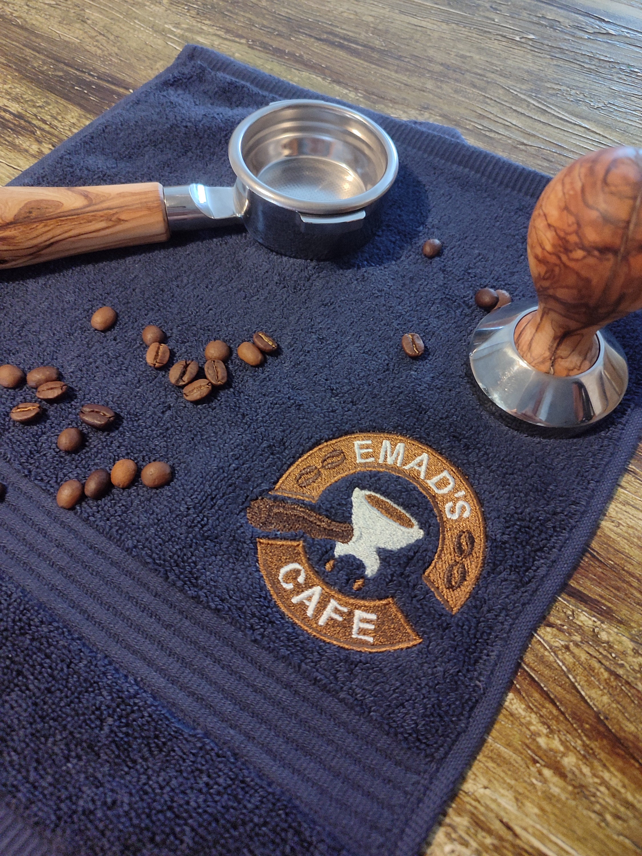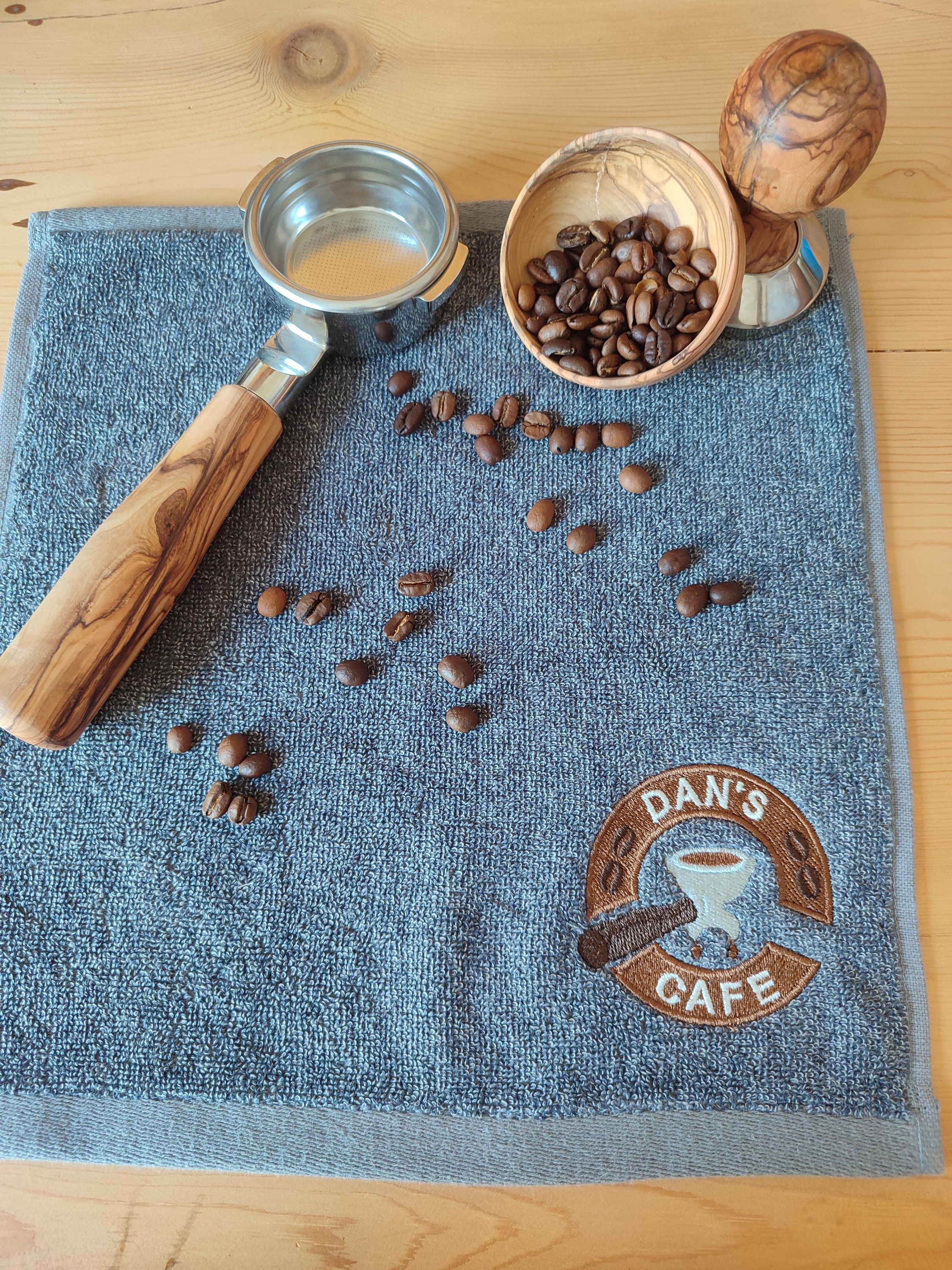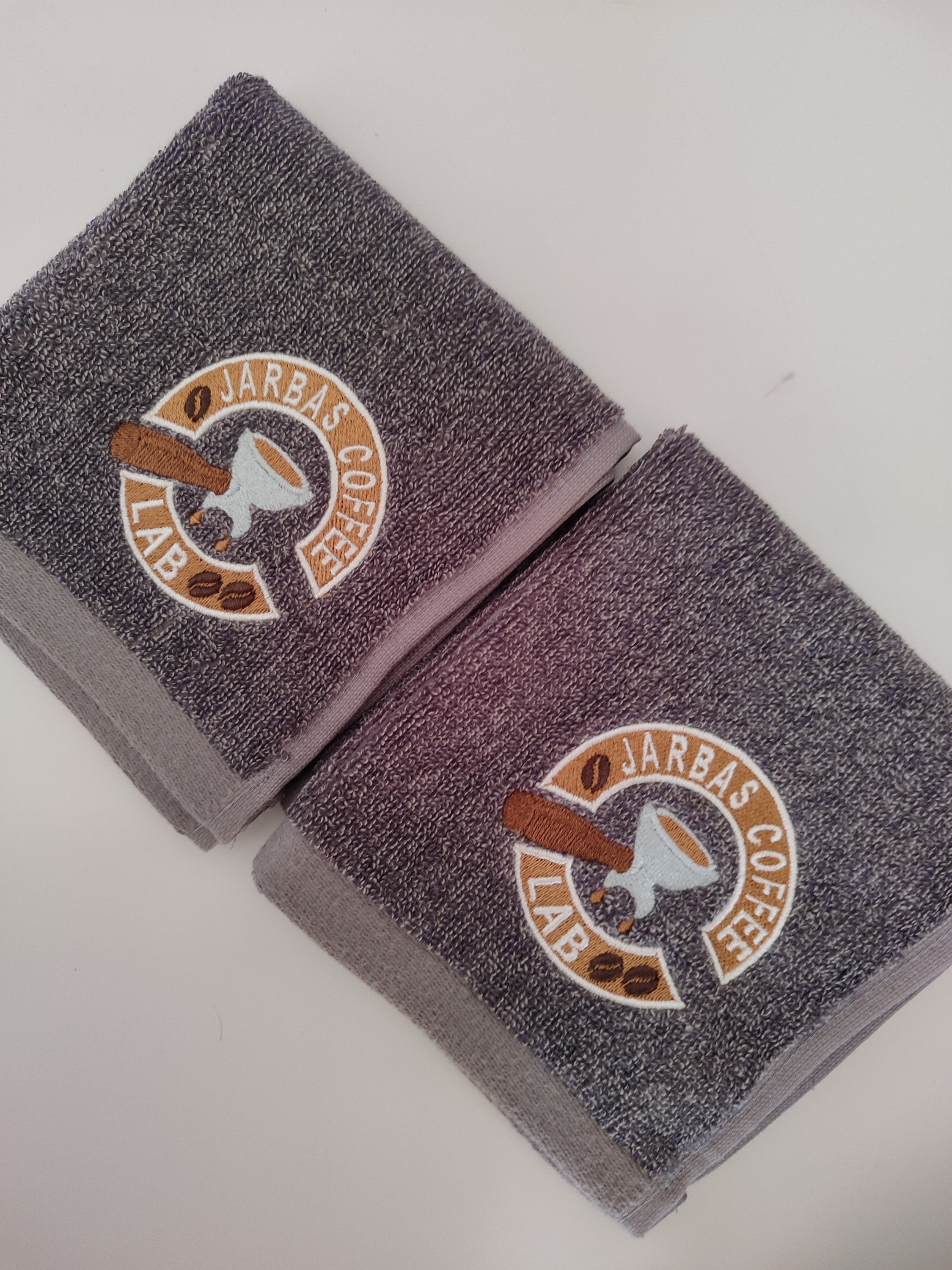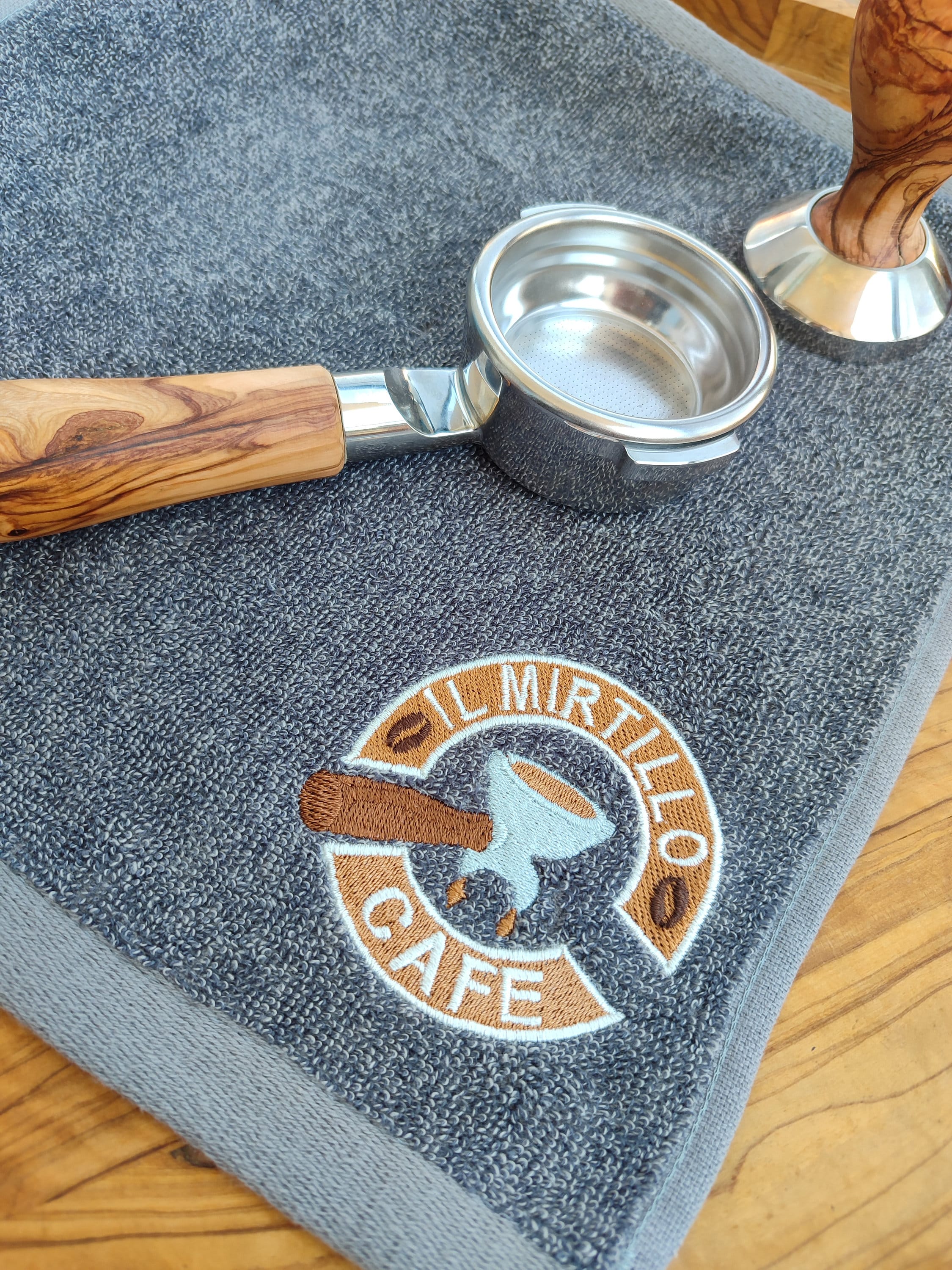 A 30 cm square dark grey and dark blue towel with a personalised portafilter logo.