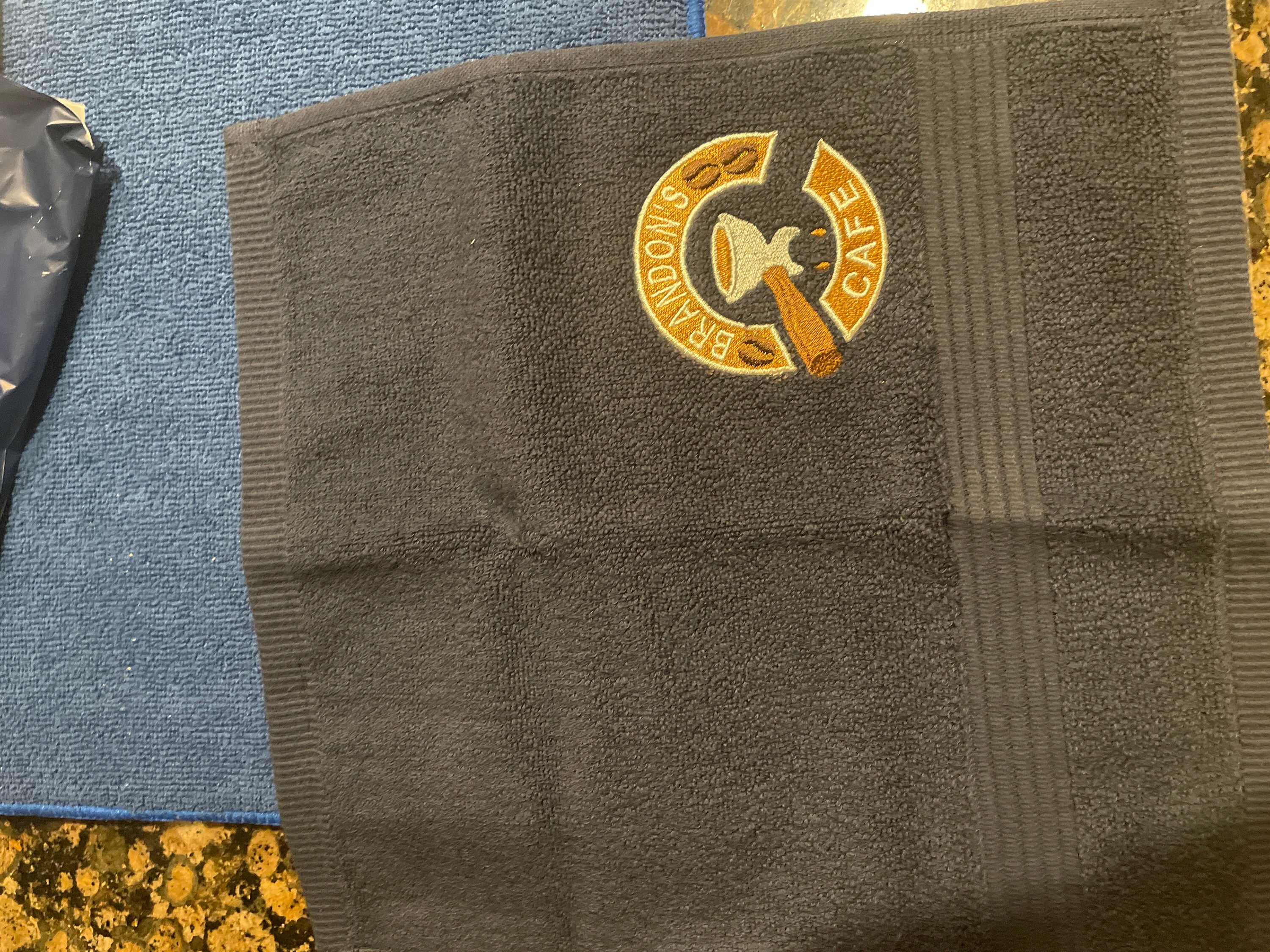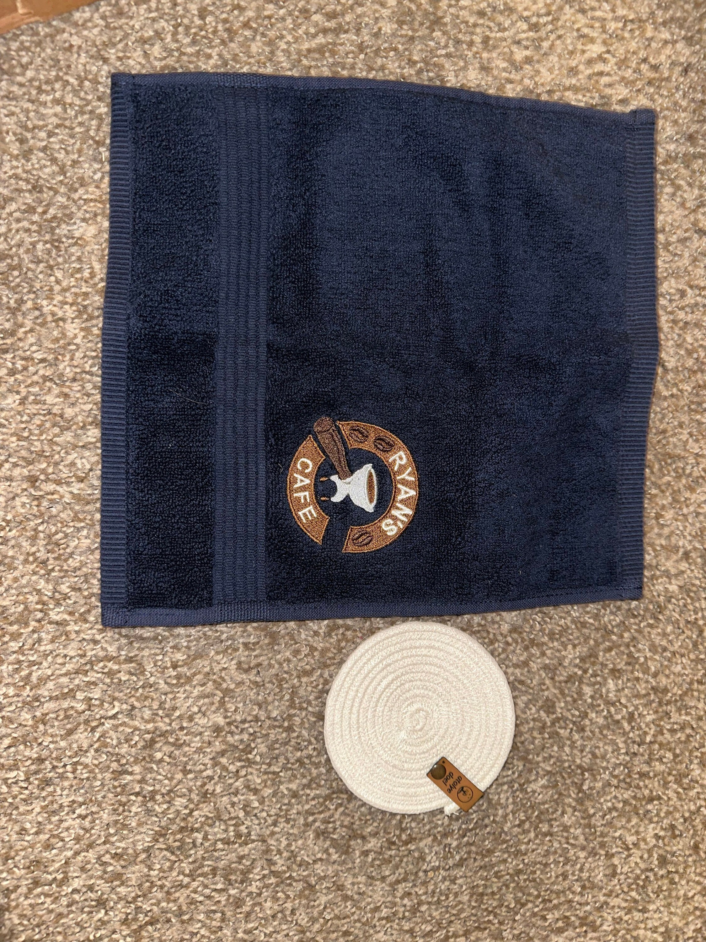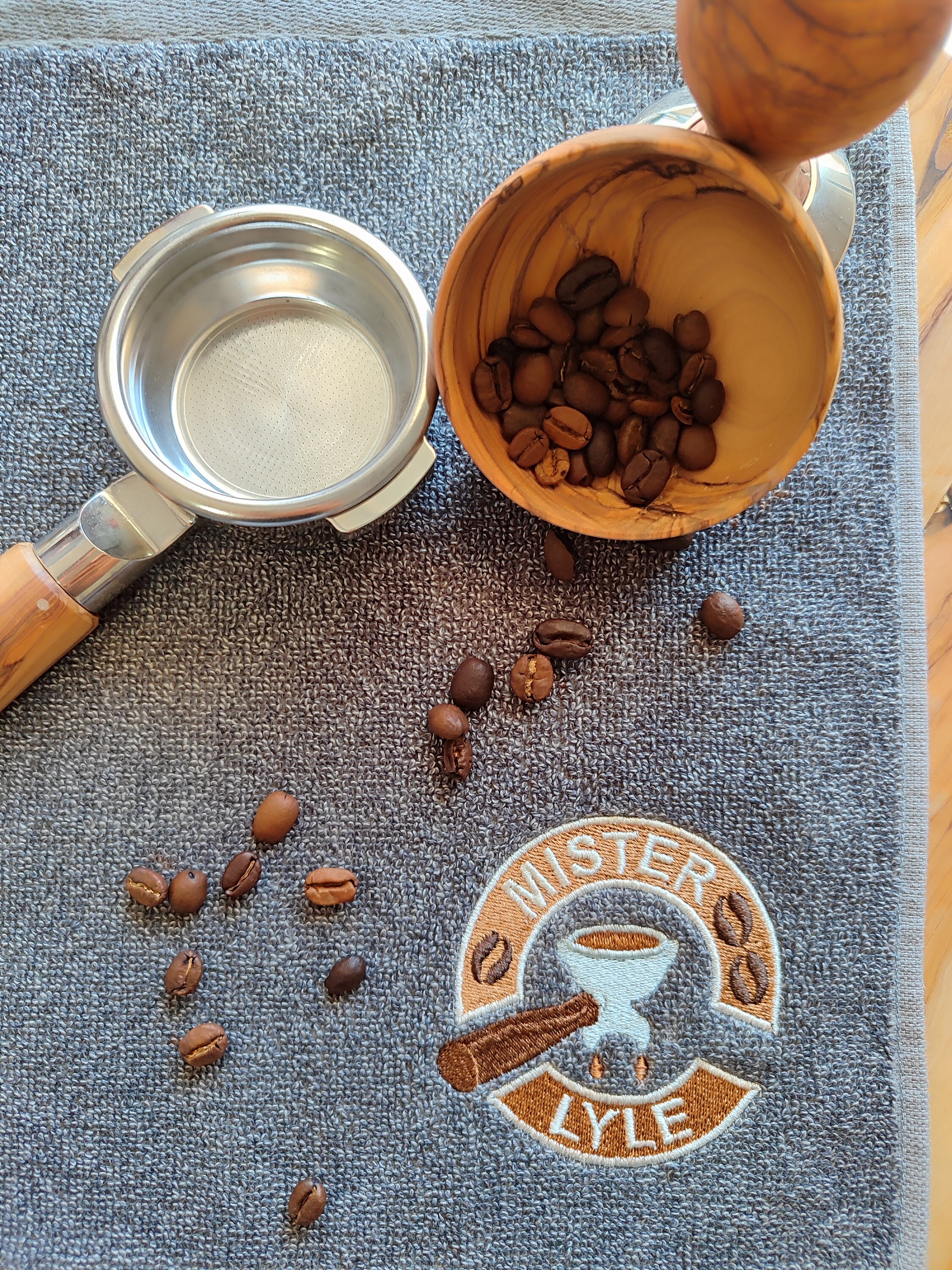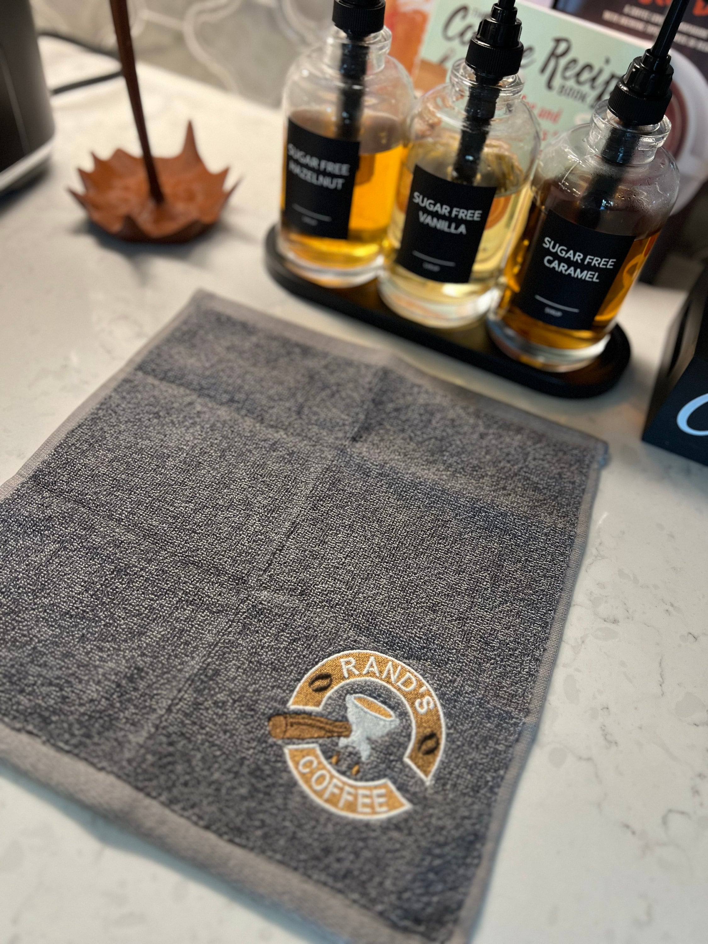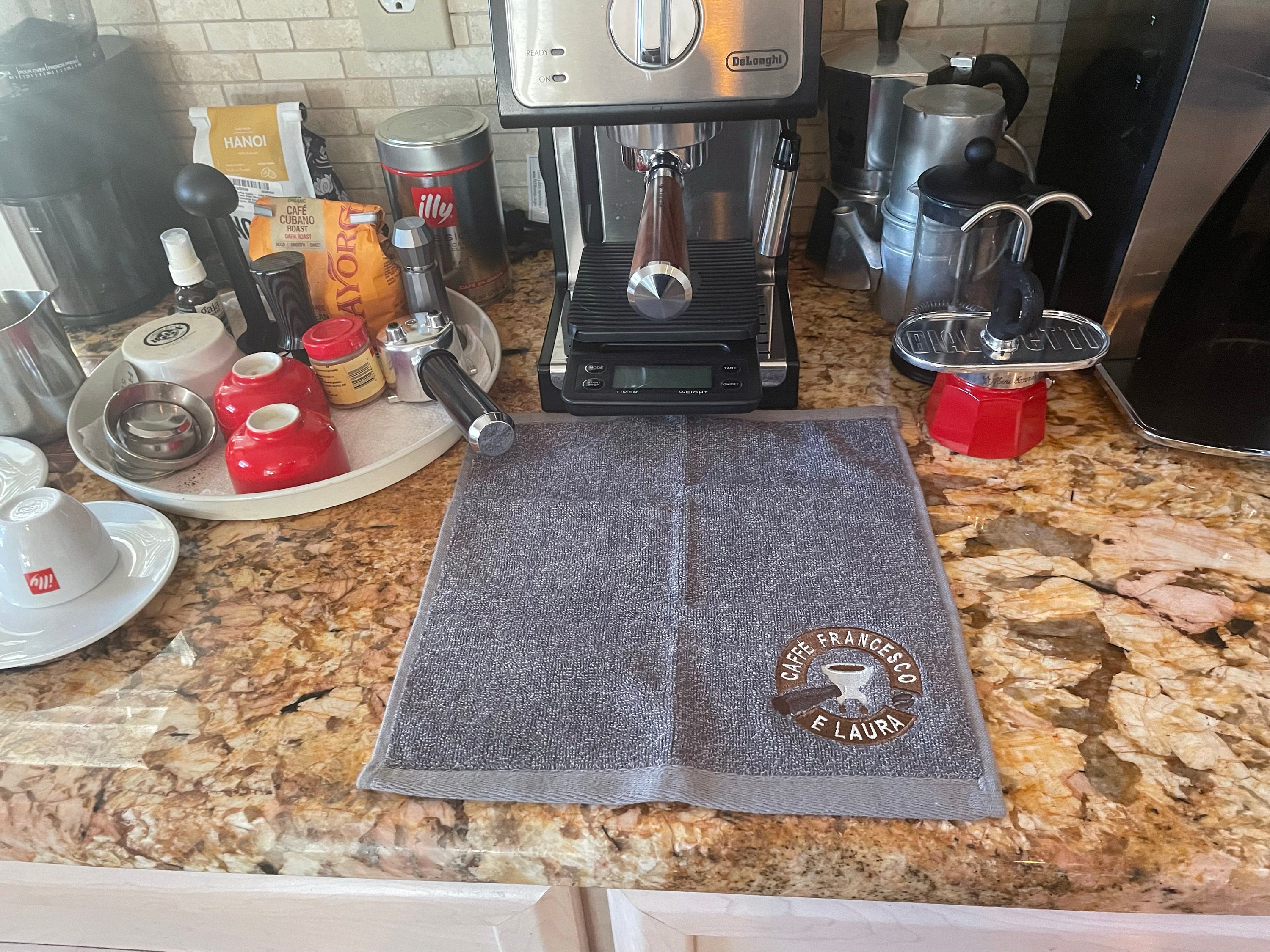 A 30 cm square dark grey and dark blue towel with a personalised portafilter logo.