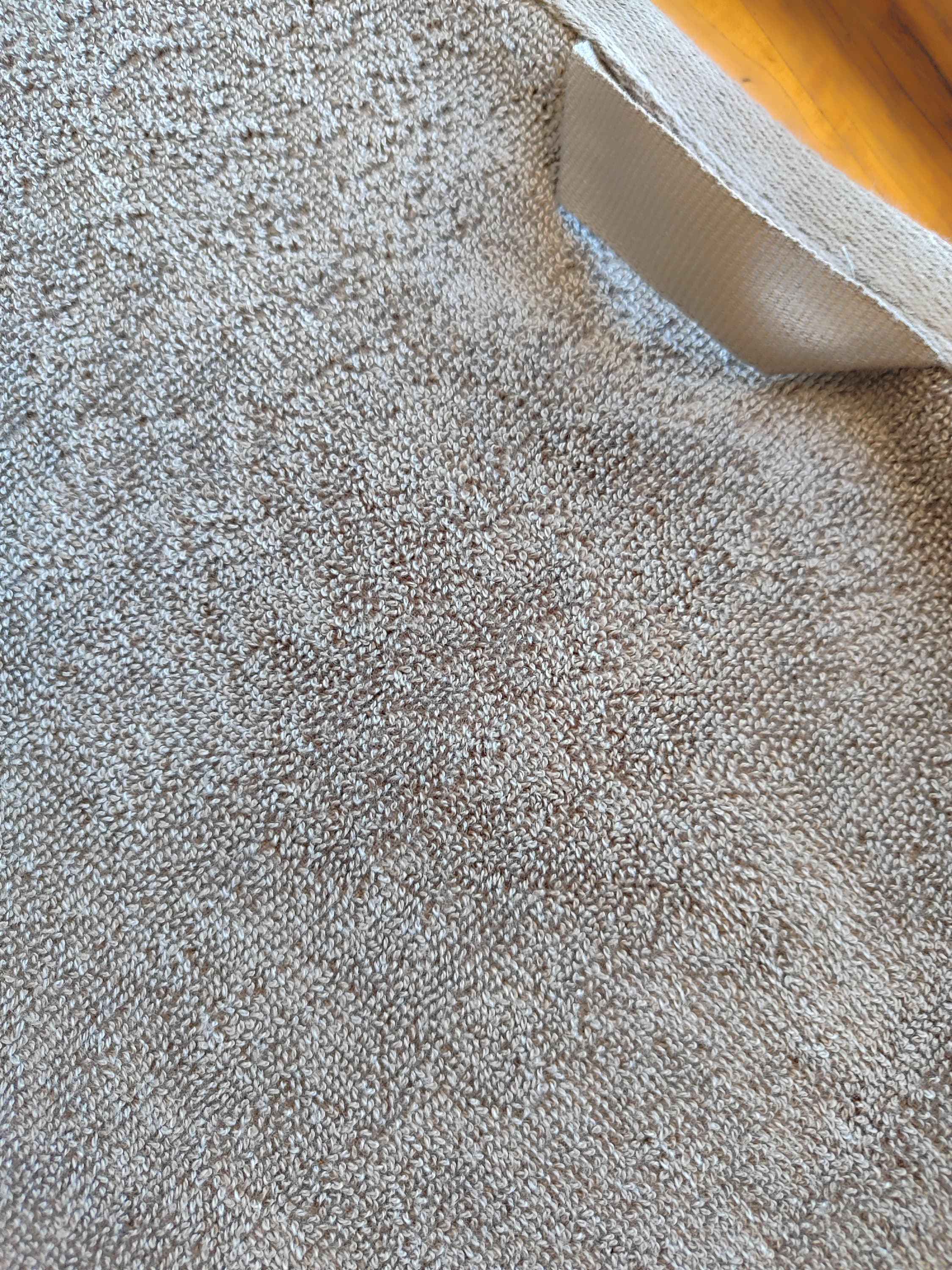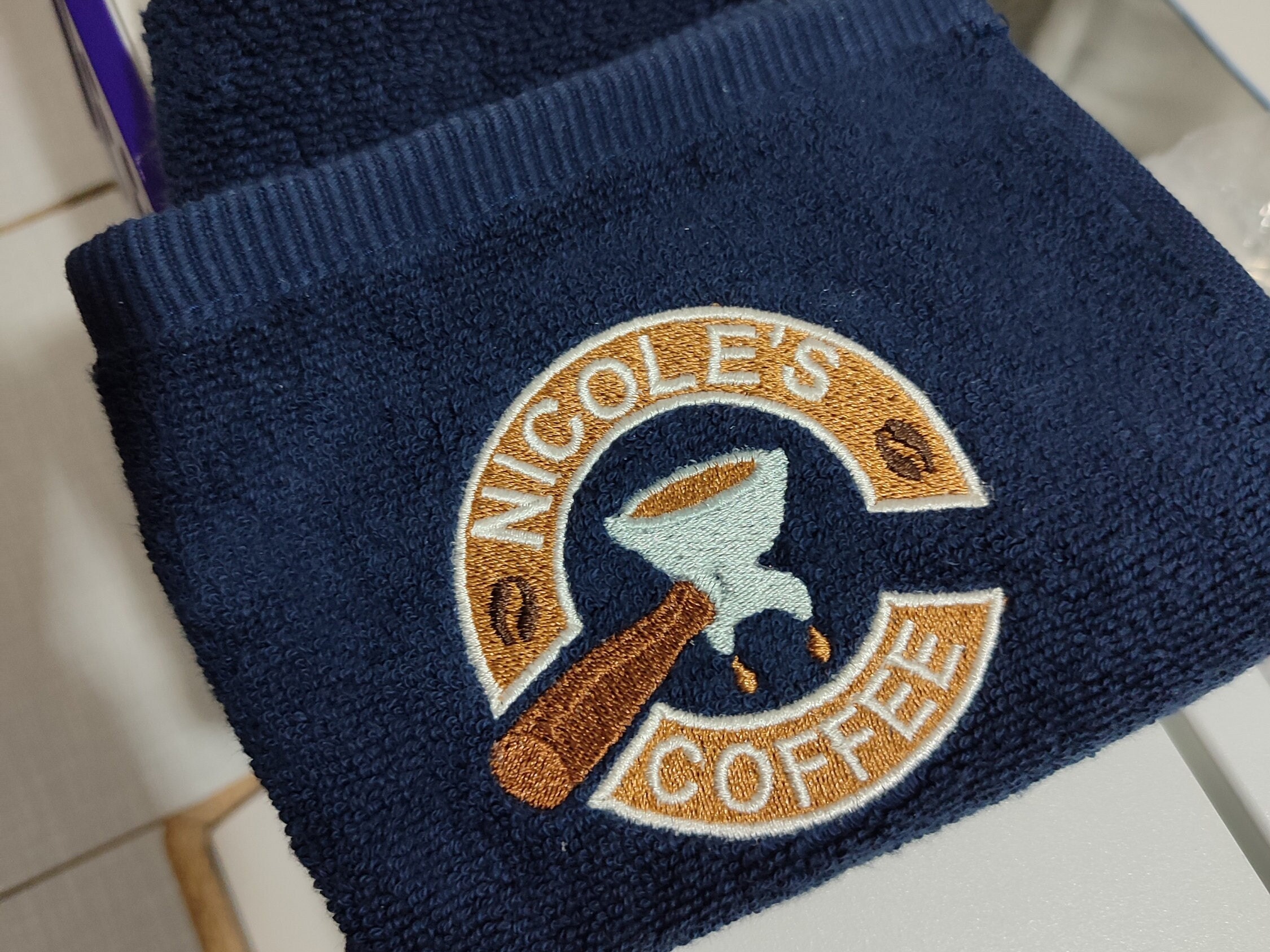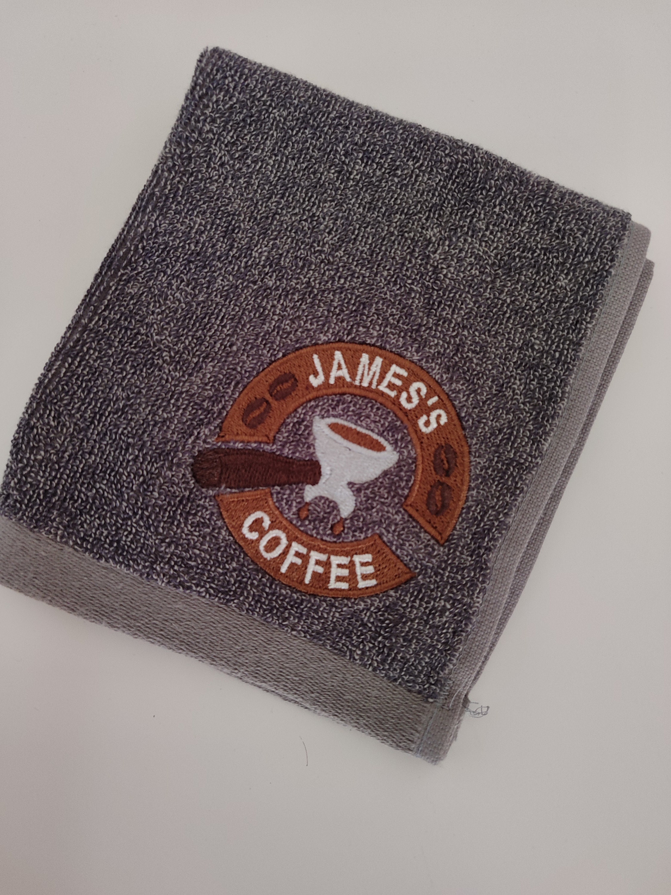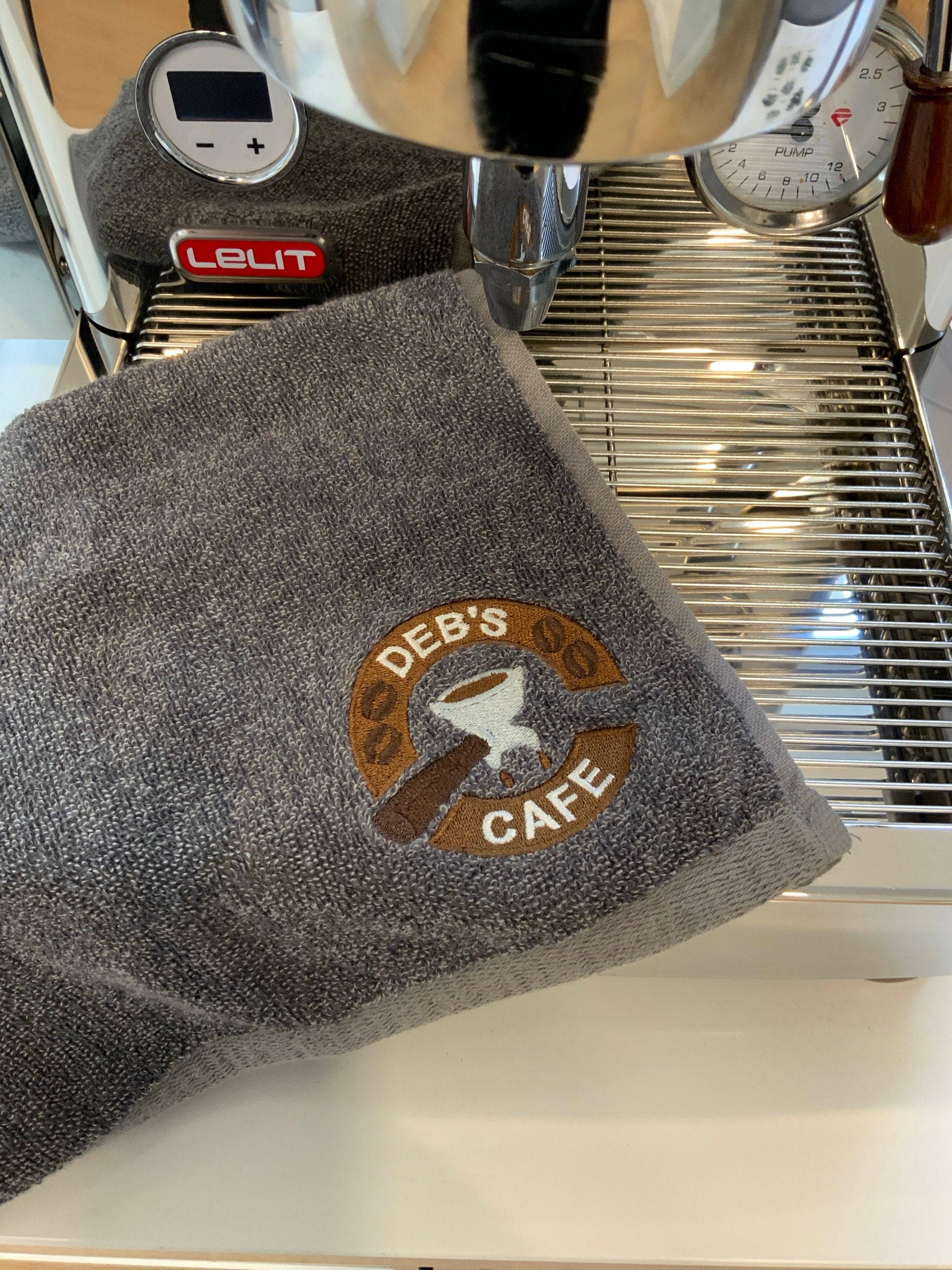 A 30 cm square dark grey and dark blue towel with a personalised portafilter logo.